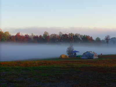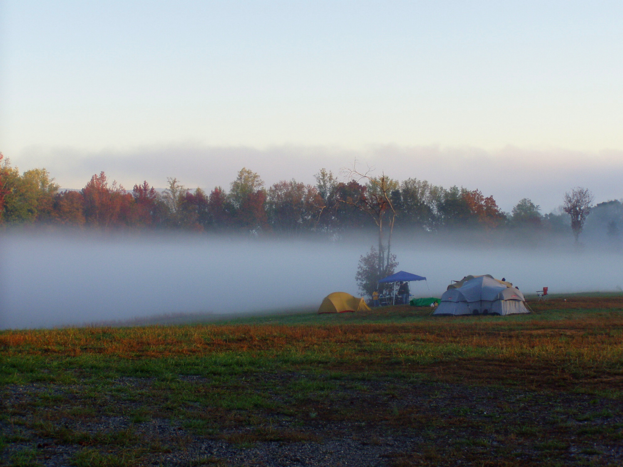 This campground was just awakening one morning, with people crawling out of their sleeping bags and into a blanket of fog.