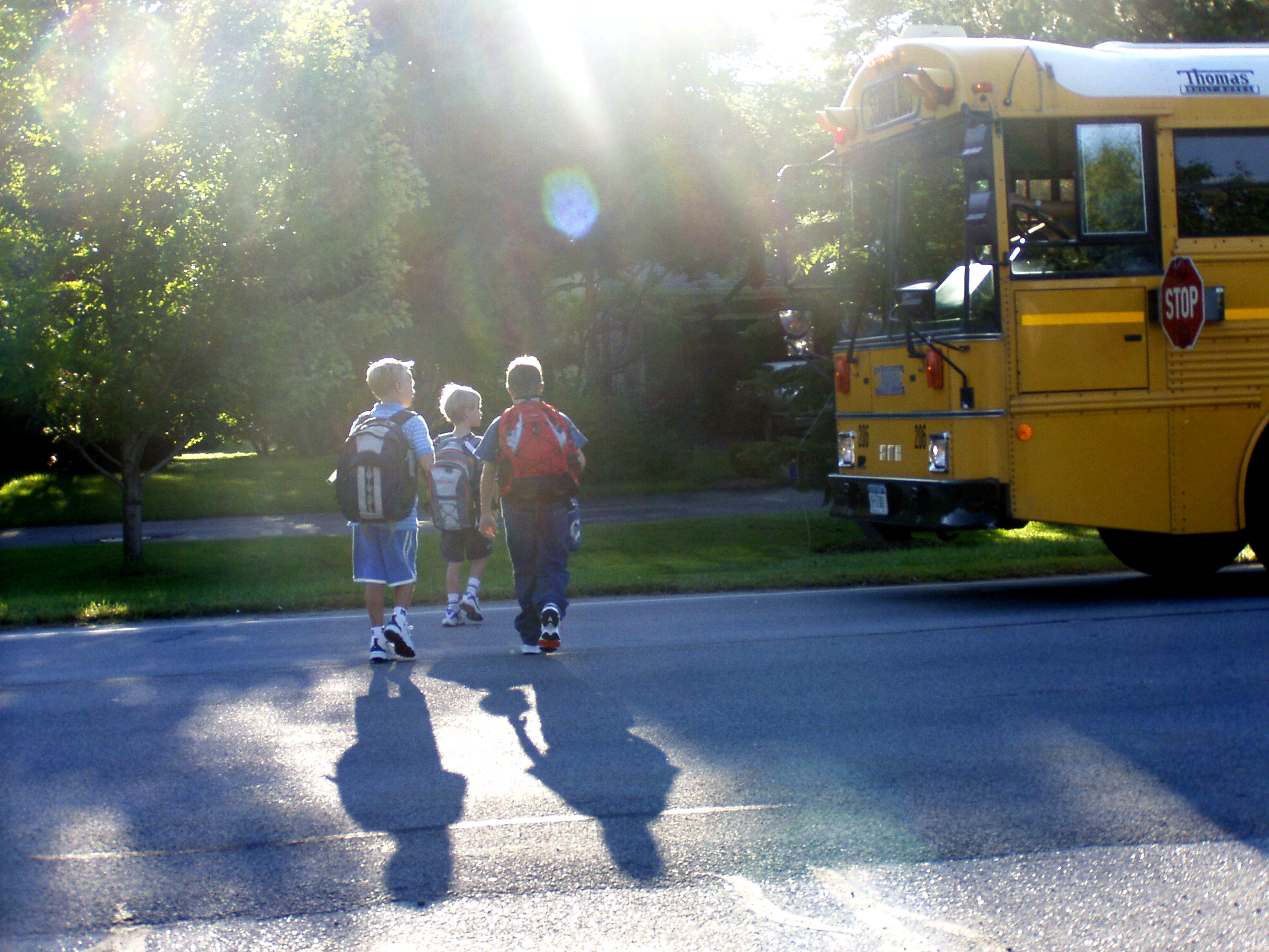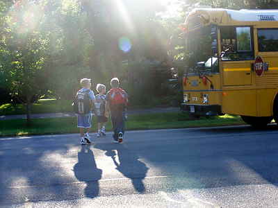 It's always a beautiful morning on the first day of school. Here three lads could not be more eager to board the bus.