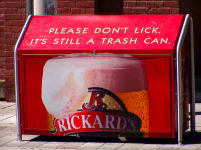A company with a sense of humor can't be all bad. This Canadian trash container was made all the more appealing by the tasty beer photo and cute copy line. I don't care where the message is printed, the beer still looks good.