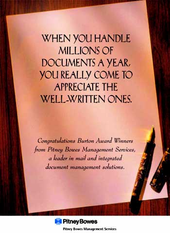The Burton Award is the "Pulitzer" of legal writing. Since 1999, this unique national awards program has honored effective legal writing. Awards are given to law firms and law school students who use plain, clear and concise language and avoid archaic, stilted legalese. Pitney Bowes is a document management leader. This ad was done for a Burton Awards program several years ago.