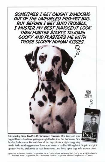 This ad was part of a series I created for Saatchi & Saatchi (Rochester) client Agway. The client was introducing a high performance, premium pet food brand wanted to convey the notion that it understood the mindset of animals to the degree it could really get inside their heads. It is quite possible that the headline is actually longer than the body copy in this ad. Anyone want to check that?