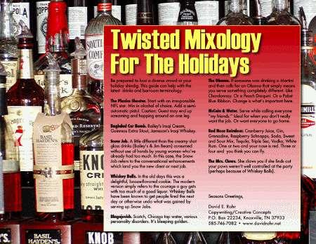 Drinking is getting such a bad rap in this health conscious society that I thought I should do something on behalf of the pastime. There is also the fact that I was sitting in a bar when the thought occured that "Gee, I really don't have a Christmas card idea, yet." I had my camera with me, too.